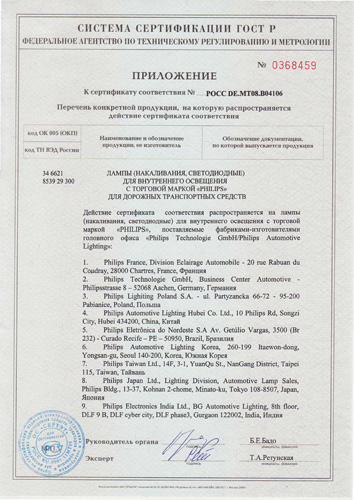 Сертификат лампы внутреннего освещения Philips